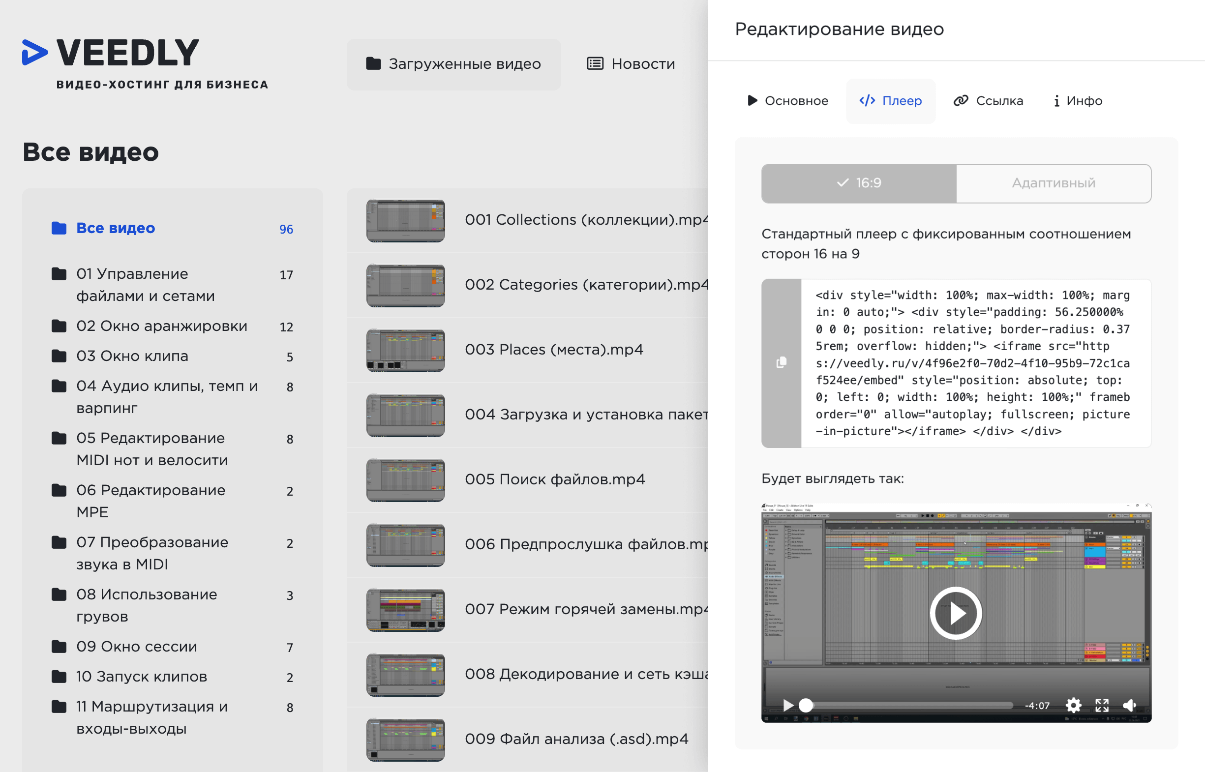 Для каждого видео доступен свой HTML-код для вставки плеера на сайт. Вы можете размещать код на любых страницах своих сайтов.